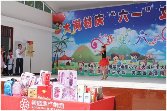 首頁 > 新聞中心 > 公司新聞綠樹陰濃夏日長,在天朗氣清的季節里,美盛地產集團高管及員工代表于6月1日再次來到商丘睢縣蓼堤鎮大崗村“唐學元希望小學”,參加了學校組織的六一兒童節文藝聯歡會并為孩子帶去了節日禮物。