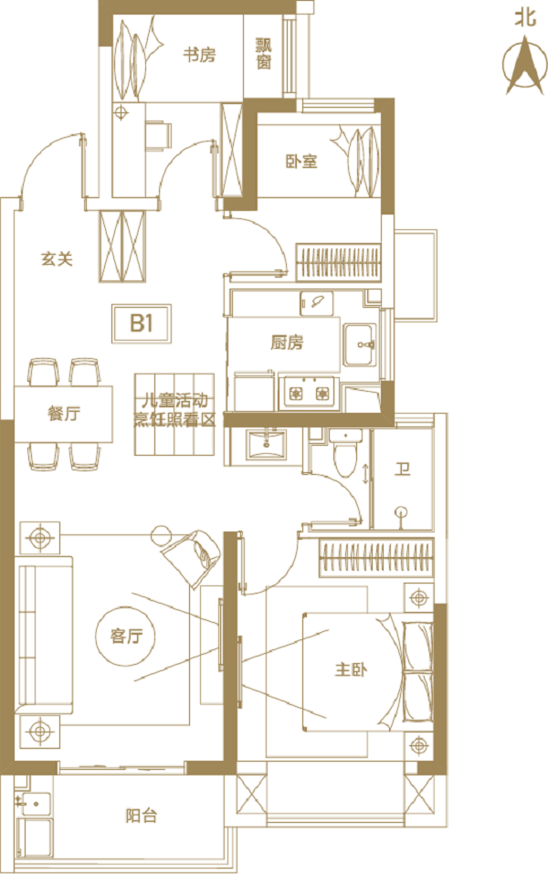主臥與客廳均朝南,滿足全家人的采光需要;同時專門設置了兒童娛樂烹飪照看區,時刻關切孩子成長的每一瞬間。