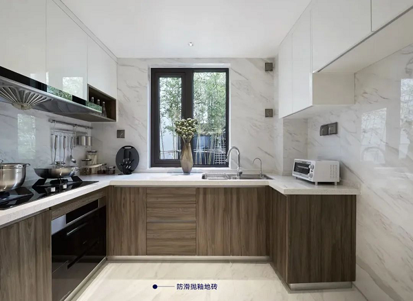 采用防滑拋釉地磚,防止地面因沾水濕滑出現(xiàn)滑倒的情況發(fā)生,更好保障家人的安全。
