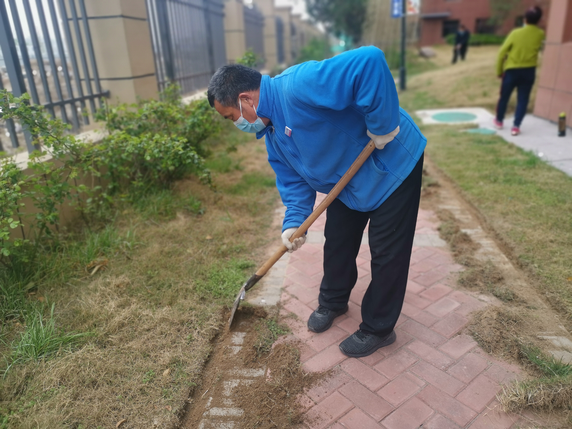 因?yàn)闆]有文化,小學(xué)畢業(yè)不識幾個(gè)大字,所以不知道那么多大道理,但是清楚怎么做能讓自己踏實(shí)。靦腆,或許是因?yàn)橛兄┰S不自信,但是說到自己的工作,頭頭是道,認(rèn)真的表情很感染身邊的人。看著他挖隔離溝的動(dòng)作,突然問他,“這的很費(fèi)力吧?”他笑著說,“那可不,得用巧勁,這里面也是有研究的,不費(fèi)力但是費(fèi)鞋!彼钢杆沦I的鞋笑道,“看看,鞋底都要磨穿了!”后來,與徐莊環(huán)境主管交談,得知王師傅是徐莊本地村民,他在疫情期間主動(dòng)協(xié)助門崗給村民檢查、測體溫、溝通,也讓項(xiàng)目的疫情管控增加了便利。
